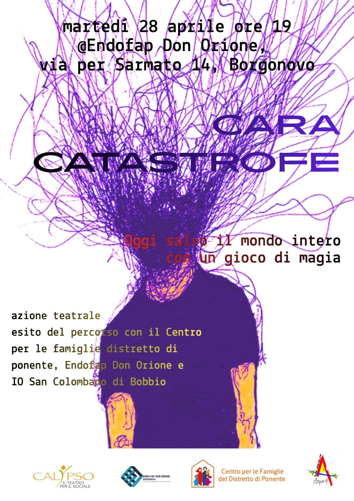Invito all'azione teatrale CARA CATASTROFE, esito del percorso teatrale e di formazione tenutosi nel corso degli ultimi mesi presso il Centro Famiglie, in collaborazione con l’Ass. CALYPSO.